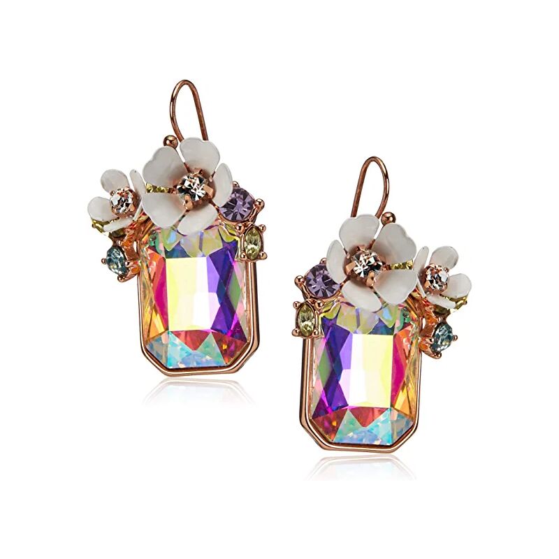 Orecchini a goccia caratterizzati da pietra iridescente a forma di rettangolo impreziosita da fiore e grappolo di pietre miste. Gli orecchini sono incastonati in metallo color oro rosa con chiusura a gancio. Metallo color oro rosa con vetro e resina epossidica Lunghezza: 1,75" Larghezza: 0,75" Chiusura con amo da pesca Importato
