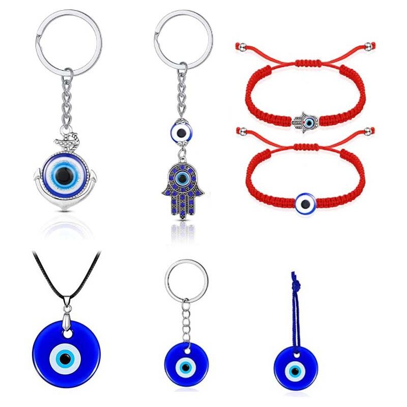 Design: La collana turca Evil Eye ti protegge dal male e da tutte le cose cattive, è una collana fortunata per te, la tua famiglia e i tuoi amici. Materiale: Il ciondolo della collana è realizzato in vetro con una catena in cordoncino di cuoio. Il ciondolo in vetro è spesso e non si rompe facilmente. Taglia: (7 pezzi) Dimensioni come mostrato, per soddisfare le tue varie esigenze, tra cui collana, portachiavi, cordino, ancora, ciondolo con chiave di palma, braccialetto per occhi, braccialetto con palma REGALO PERFETTO: La collana Evil Eye è perfetta per fare regali. Perfetto per compleanno, regalo di ringraziamento, anniversario, Natale, festa della mamma, San Valentino, promessa, regalo.