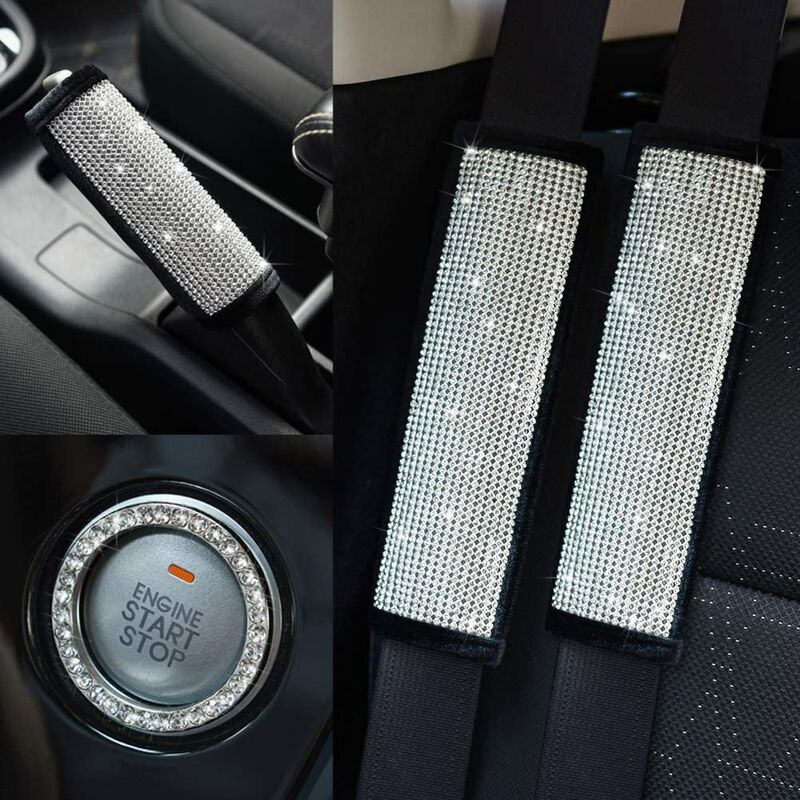 MATERIALE MORBIDO SENZA FADING - - Questo set di spalline per cintura di sicurezza è realizzato in morbido velluto di alta qualità con strass Bling Bling. 4 pezzi / set, otterrai 1 coperchio del freno a mano, 2 copri cinture di sicurezza e 1 anello del pulsante di avvio Bling, per soddisfare le tue diverse esigenze di decorazioni per auto. Set copri cinture di sicurezza Diamond, Bling sotto la luce, scintillante attraverso il parabrezza e facendo brillare la tua auto. Un ottimo modo per aggiornare gli interni della tua auto. Regalo perfetto per donne e ragazze 【ESPERIENZA DI GUIDA CONFORTEVOLE】 - Questo set di copri cinture di sicurezza con strass è progettato per adulti, donne e bambini e può fornire una migliore ammortizzazione in caso di frenata di emergenza o incidente e è in grado di proteggere le spalle della tua famiglia 【UNIVERSALE E MULTIFUNZIONALE】 - Il set di protezione della cintura di sicurezza universale è progettato per adattarsi alla maggior parte dei tipi di cintura