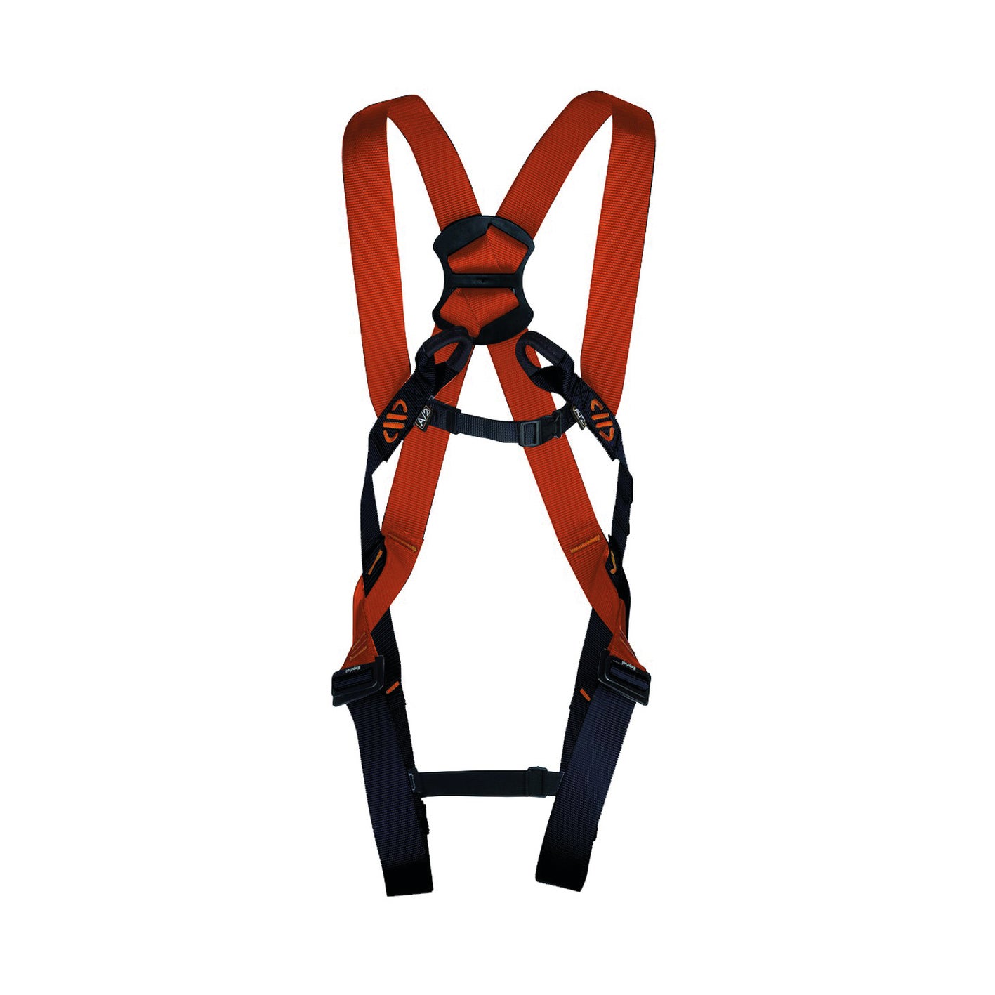 In poliammide, completa di bretelle regolabili, attacco dorsale, cosciali regolabili, attacchi sternali utilizzabili singolarmente, taglia unica