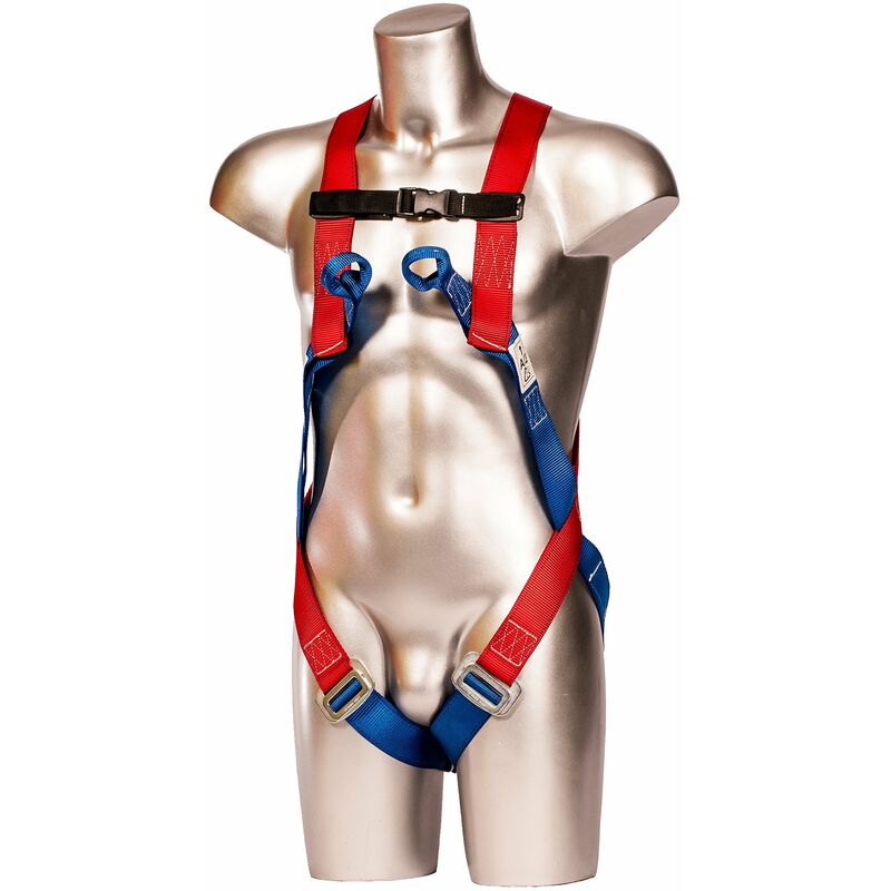 Robusta cinghia di imbracatura a tutto corpo. 2 punti di attacco: 1 sul dorso ad anello a D in acciaio e 2 passanti sul petto in tessuto, fascia toracica in nastro di poliestere nero, taglia unica.