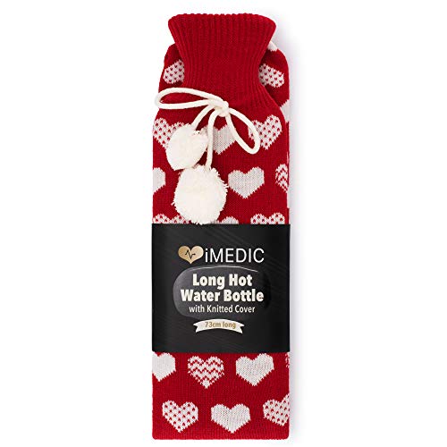 IMedic 2L Borsa Acqua Calda Lunga - Borsa Acqua Calda Collo Cervicale Ricoperta da una Fodera di Lusso Realizzata in Pile Super Morbido o Maglia Comoda - Cuori Lavorati a Maglia (Rossi)