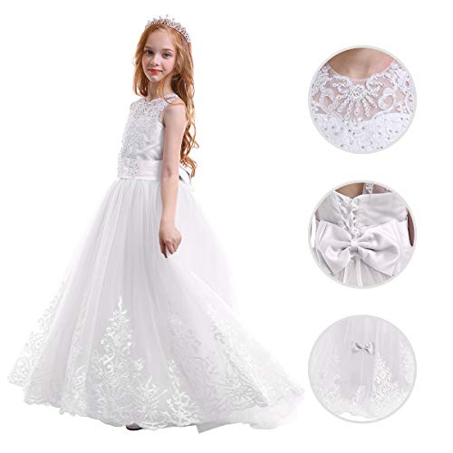 IMEKIS Abito da Ragazza di Fiore Elegante Abito da Damigella d'Onore da Cerimonia Senza Maniche Ricamato in Pizzo Principessa Tulle Sera Abito Lungo Compleanno Festa Abito da Ballo Bianco 4-5 Anni