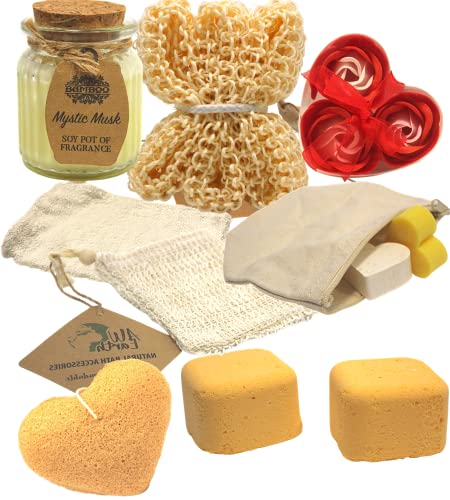Imero Set bellezza, Regalo donna fatto a mano Profumato, 11 pezzi, Spugna doccia Scrub corpo esfoliante, Rose di sapone, Frizzanti doccia, Cotone Naturale