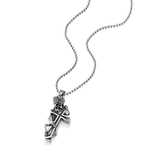 IMETACLII Uomo Donna Annata Croce Corona Cranio Teschio Scheletro Osseo Ciondolo, Collana con Pendente, Acciaio, Palla Catena 75CM