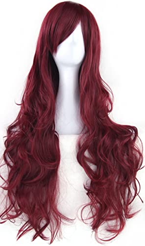 IMISSU 80cm Parrucca cosplay capelli lunghi ricci naturali con frangia Parrucche colorate per feste in costume di Halloween per le donne (Borgogna)