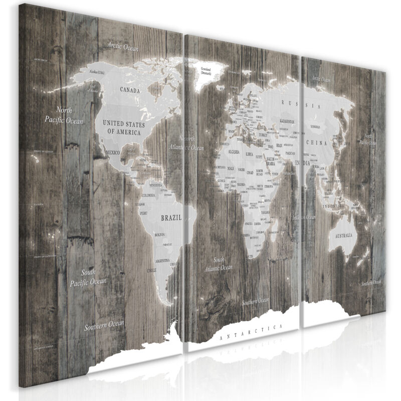 Un dipinto su tela come decorazione impressionante. Dipinti unici con motivi estetici sono il complemento perfetto per una disposizione elegante. Con un po' di creatività, possono essere facilmente abbinati a qualsiasi stile di arredamento. Il quadro su tela "Picture - World Map: Wooden World (3 Parts)" è un elemento decorativo unico e quasi universale. Piacerà a tutti coloro che cercano decorazioni originali per completare la propria sistemazione. Posizionalo nel tuo interno e vedrai che è completo e non avrai più bisogno di altre aggiunte. Non devi preoccuparti della qualità e dell'aspetto della tua decorazione. I dipinti su tela disponibili in offerta riproducono fedelmente i dettagli. La risoluzione di stampa opportunamente regolata garantisce l'intensità dei colori e la nitidezza del motivo presentato. Questi tipi di prodotti sono la soluzione perfetta se ti lamenti ancora dello spazio vuoto sul muro e ti chiedi come riempirlo. È un elemento decorativo elegante che rende gli