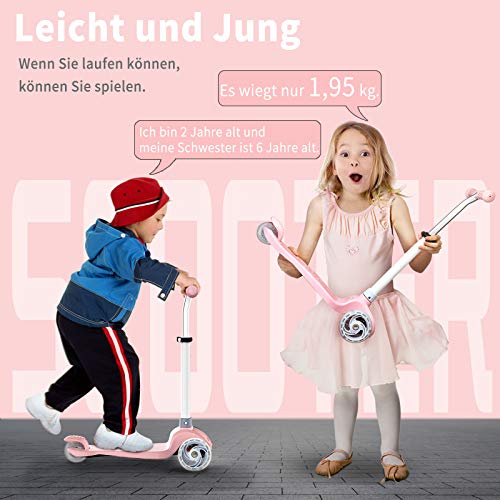 IMMEK Monopattino per bambini a partire dai 2 anni di età, con 3 ruote LED in PU, altezza del manubrio regolabile e peso massimo di 50 kg (rosa)
