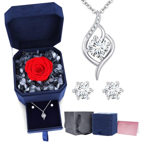 IMMORROSA Vera Rosa Eterna con Collana in Argento 925 con Cristalli e Orecchini in Cristallo 925, Rosa Conservata con Confezione Scatola Regali di Compleanno per Donne Compleanno Natale San Valentino