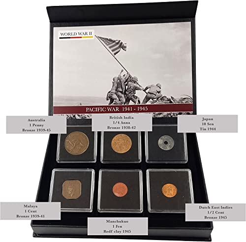 Tesoro senza tempo - Straordinaria collezione storica di 6 monete originali che hanno fatto parte della seconda guerra mondiale. Coniati tra il 1938 e il 1945 dai paesi che furono occupati dai giapponesi o che parteciparono alla guerra del Pacifico durante la seconda guerra mondiale. Australia, India britannica, Indocina francese, Malesia, Manchukuo e Indie orientali olandesi.