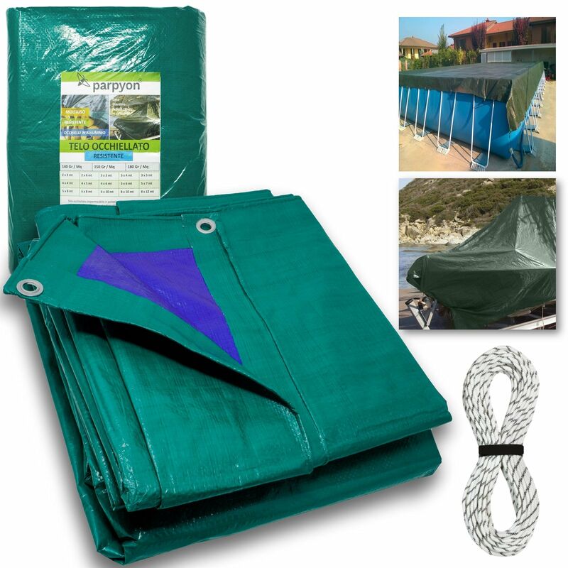 PARPYON Telo impermeabile esterno Resistente da 140gr/mq telo copritutto telone occhiellato ombreggiante per gazebo piscina campeggio mobili giardino TELO OCCHIELLATO: Parpyon Telo impermeabile esterno Multiuso in materiale PVC rinforzato con occhielli in alluminio per fissaggio facile + Cordino 10MT in OMAGGIO. Disponibile in vari modelli di diverse dimensioni e consistenza - per tutte le attività all'aperto. DIMENSIONI: Telone copritutto con VARIE DIMENSIONI. Consistenza 140gr/Mq con occhielli in metallo lungo il perimetro per un facile fissaggio. Ideale per copertura piscina, come telo ombreggiante in campeggio, copertura mobili da giardino e attrezzi. CARATTERISTICHE: Il telo è costruito in materiale PVC impermeabile e resistente, protegge dai raggi solari, pioggia, neve, Dotato di occhielli in metallo lungo il perimetro del telone, i colori cambiano in base alla grammatura del telo scelto (vedi foto) UTILIZZO: I Telo occhiellato Parpyon è ideale per copertura impermeabile di