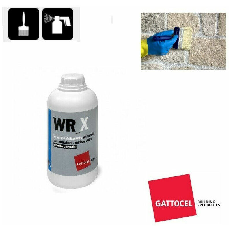 GATTOCEL WR_X 1 LITRO CAMPO DI IMPIEGO: Si utilizza su superfici interne ed esterne verticali o inclinate in cotto, marmo, pietra, tufo, intonaco, arenaria, cemento. Specifico per muri in pietra naturale, facciavista e simili. VANTAGGI: WR-X è un impregnante con azione idrorepellente-protettiva e di esaltazione dei colori. Conferisce un aspetto finale semilucido e garantisce una sicura e duratura protezione contro umidità, piogge, smog, gelate, etc... Evita la formazione di efflorescenze, muffe e salnitro. AVVERTENZE: Non usare su superfici calpestabili. RESA: Lt 0,17÷0,35/mq. secondo il tipo di supporto e di "effetto bagnato" che si intende ottenere. CARATTERISTICHE FISICHE: Soluzione di resine sintetiche e silossaniche Aspetto Liquido Colore Lattiginoso Peso specifico 1,010 MODALITA' D'USO: Le superfici da trattare devono essere pulite, asciutte in profondità e prive di residui di trattamenti precedenti. Eventuali fessure o cavità devono essere otturate. WR-X è pronto all'uso e si
