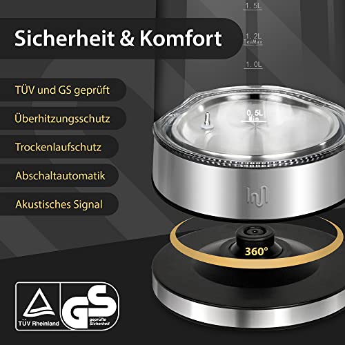 Sicurezza: il bollitore è testato TÜV e GS e soddisfa tutti i criteri di sicurezza. Il nostro prodotto ha una protezione contro il surriscaldamento e l'asciugatura che garantisce la sicurezza durante il funzionamento.