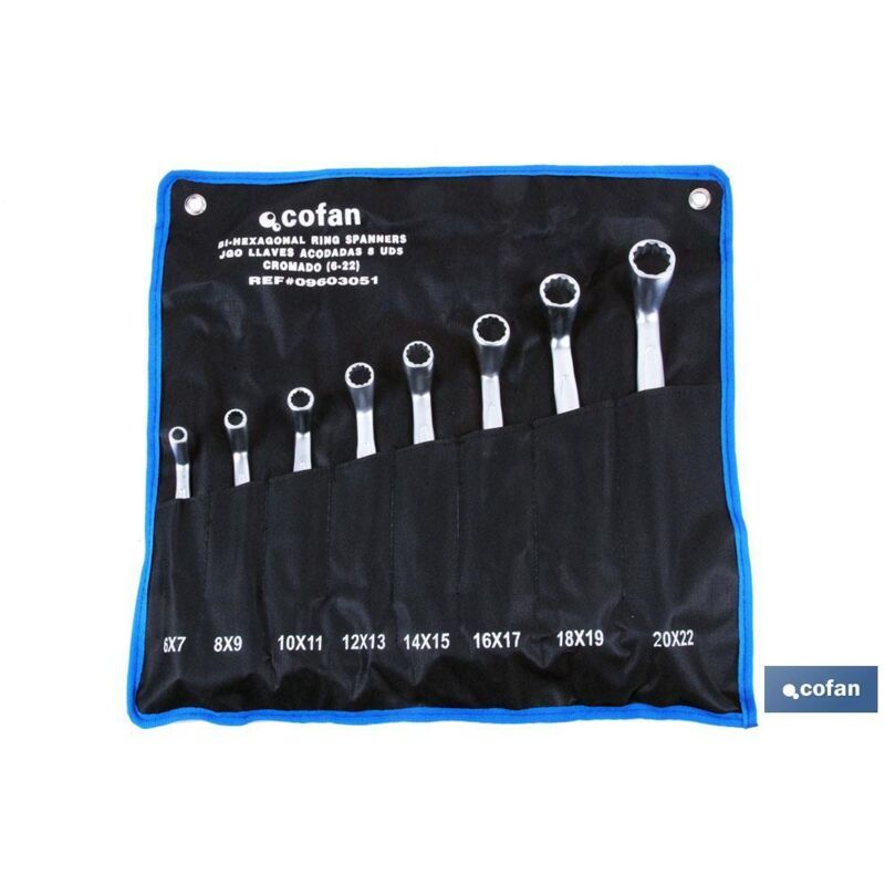 Set di chiavi a stella doppie e sfalsate lucide. Queste chiavi sono realizzate in acciaio al cromo vanadio di alta qualità che garantisce maggiore resistenza e durata. Il lato ad anello a parete sottile consente all'utente di lavorare anche in spazi ri