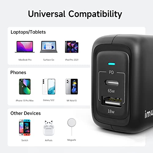 Imuto Caricabatterie USB C 65W GaN Tech, Alimentatore USB C Caricatore Presa 2 Porte, Caricatore USB da Muro Compatibile con MacBook Pro/Air, iPhone 12/Pro/Mini, iPad Pro, Galaxy S20, Pixel (nero)