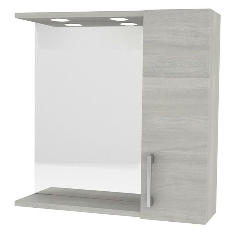 Specchiera con pensile contenitore e anta con apertura esterna, faretti LED superiori Lo specchio contenitore è una soluzione pratica ed efficiente che assolve ad una doppia funzione: pensile e specchio insieme, una composizione capace di offrire ampio spazio di archiviazione, aggiungendo un importante tocco di luminosità ed eleganza. La specchiera è realizzato in legno truciolare con una finitura rovere grigio che si adatta facilmente a diversi arredamenti;