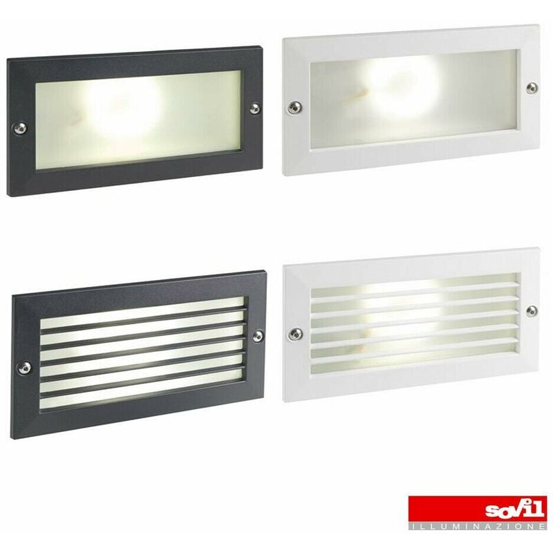 Faretto segnapasso in alluminio a incasso Led 10 W escape Sovil: disponibile Bianco, Nero con e senza Gabbia Incasso a parete in alluminio pressofuso e controscatola in termoplastico, nato p er illuminare muretti, giardini e vialetti. Ideale quando la luce ha compiti di indicazione di passaggi pedonali, di ostacoli ambientali e di delimitazione. Illuminazione a LED 230V. Luce diretta con diffusore in vetro satinato, disponibile nella versione con griglia frangiluce. LED 10W (SMD 2835 14pcs). Disegnato per ambientazioni esterne . Caratteristiche: Applique in pressofusione di alluminio modello Escape Diffusore in vetro satinato Colori: Bianco goffrato e nero goffrato. Illuminazione a 14 LED SMD 2835 Modulo Led sostituibile Consumo: 10W Resa: 100W Risparmio energetico: 85% Flusso luminoso: 700 lumen Temperatura di colore: 4000°K Clase di protezione IP54 Alimentazione: 230V. Dimensioni Larghezza: 19,2 cm Altezza: 10,3 cm Profondità: 4,8 cm