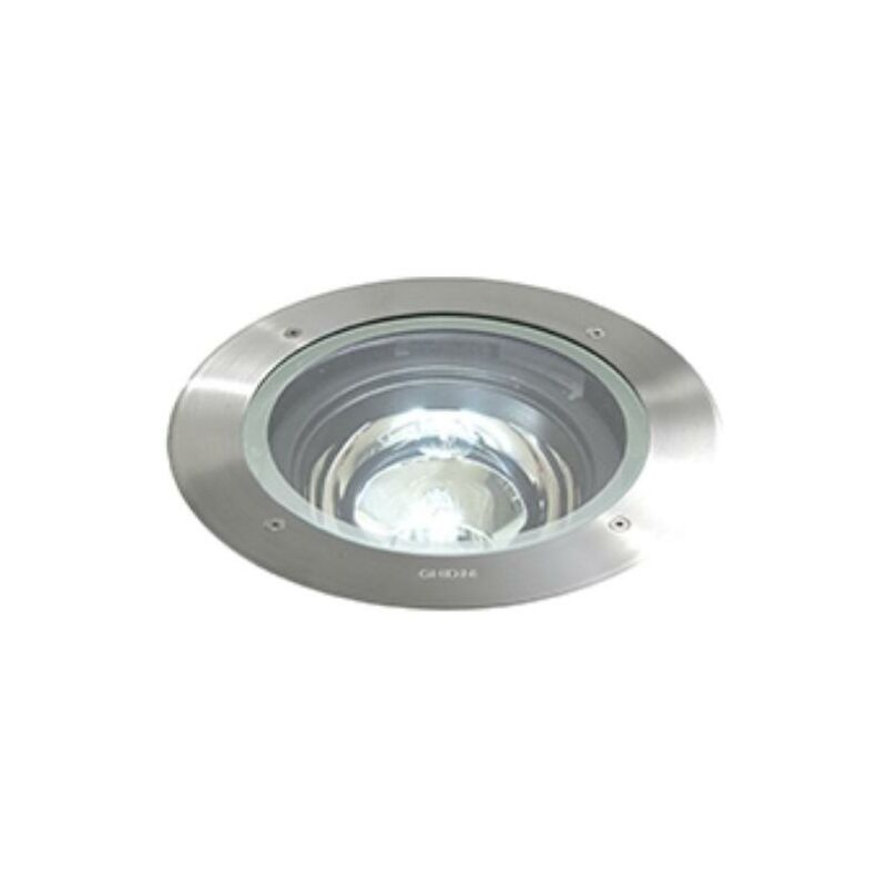 Faro da incasso a pavimento, tondo con borchia in acciaio inox e vetro diffusore temperato trasparente;