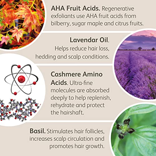 AIUTA LE CONDIZIONI DEL CAPELLO - Gli acidi naturali della frutta (AHA) antiforfora e antiossidanti e gli estratti vegetali aiutano a eliminare la desquamazione. Principi attivi delicati come il basilico stimolano il flusso sanguigno, favorendo il rinnovamento cellulare per una crescita sana del cuoio capelluto e dei capelli. Le proprietà antinfiammatorie, antibatteriche e antisettiche dell'olio di lavanda aiutano a ridurre la perdita di capelli, la caduta e le condizioni del cuoio capelluto.
