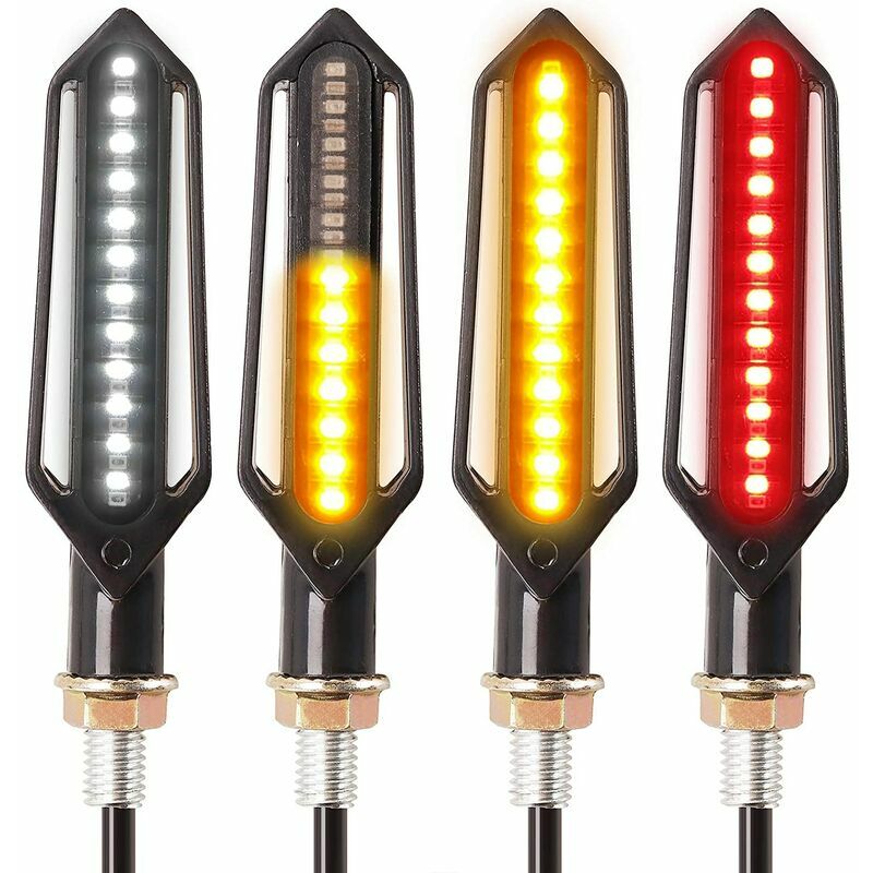 4 indicatori per moto - Viene fornito con 4 indicatori di direzione, 12 V universali adatti per moto, moto, scooter, quad cruiser fuoristrada. ottimo per indicatori di direzione e indicatori di direzione. 【Funzione luce di marcia diurna e luce freno】 Luce freno: il tallone rosso lampeggerà 3 volte durante la frenata, quindi si accenderà (Nota: l'indicatore di direzione verrà utilizzato per primo: quando la luce di marcia diurna o la luce del freno è accesa, anche l'indicatore di direzione sarà acceso contemporaneamente, solo l'indicatore di direzione è acceso in questo momento;