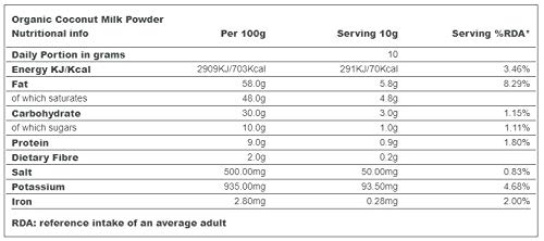 Polvere di latte di cocco biologico al 75%, maltodestrina biologica al 25% (da agricoltura biologica)