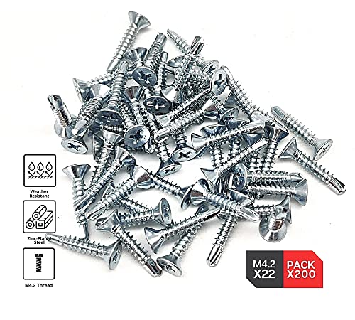 Rivetti Autofilettanti con Testa Svasata | 200 Unità | Misure: 4,2 x 22 | Spessore massimo di fissaggio: 13,3 | Impronta PH2 | Materiale: Acciaio Zincato | Impiego: Fissaggio di materiali leggeri come quadri, Lamiera alluminio, Lamiera acciaio, Lamiera zincata ondulata, Onduline tetti, Pannelli in legno compensato, Fissaggio pali legno | Ambito: Casa e Officina