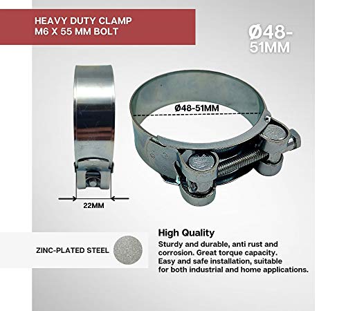 Fascette con Morsetto di Serraggio | Diametro Morsetto per Tubi: 48 - 51 mm | Serraggio da Ø23 a Ø63 mm | Processo di rivestimento: zincatura elettrolitica > 5 micron | Tipo Bullone: Testa Esagonale | Qualità del Bullone: 8.8 | Pinza di serraggio tubo cappa, morsetti grandi per tubo cappa cucina, morsetti per tubi innocenti, collari stringitubo per tubo flessibile alluminio