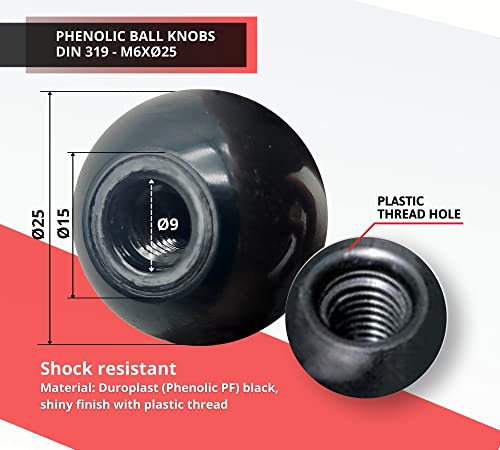⚙️ Il nostro pomello sfera è stato realizzato con plastica di alta qualità per offrire il massimo della durata ai nostri clienti. Il materiale della manopola serraggio offre un alto grado di resistenza all'impatto e all'usura. Offre, inoltre, il massimo dell'isolamento per una maggiore sicurezza nell'uso. Il pomello m6 femmina è dotato di un foro filettato (senza cuscinetto), perfetto per il montaggio con le viti. La sfera tonda è semplice da montare e comoda da utilizzare.