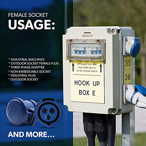 ◼️ Presa Monofase Femmina | Presa di colore blu | Voltaggio: 230v | Protezione: IP44 | Pin: 2P+T | Posizione oraria: 6H | Potenza 32A | Hertz 50/60 | SEZIONE DEL CAVO MM2: 2,5 - 10 | Ø CAVO (MM2): 12 - 18 | Uso: presa esterna camper, spina da esterno, prese per camper, presa industriale campeggio, spina cee
