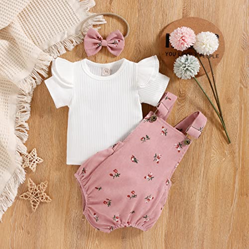 Infant Baby Girl Summer Clothes Solid Color Fly Sleeve Round Neck Tops + Flower Pattern Suspender Jumpsuit + Bow Headband (Pink, 12-18 Months)