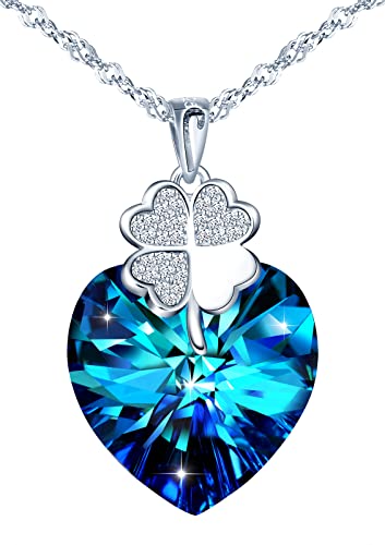 INFINIONLY Collana cuore di cristallo da donna e ragazza, Collana in argento 925, Ciondolo cuore, Pendente in cristallo cuore dell'Oceano, con mini quadrifoglio, zircone, catena da 45cm, blu oceano