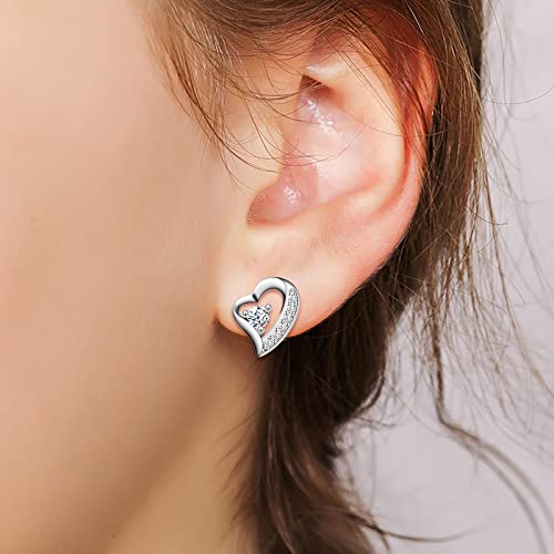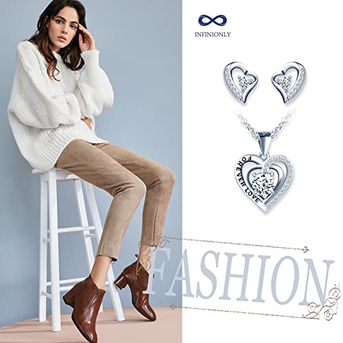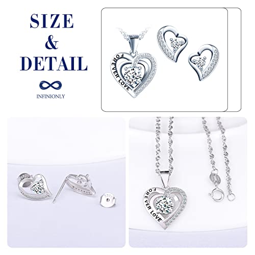 INFINIONLY Collana e Orecchini cuore da donna e ragazza, Parure di gioielli in argento 925, Ciondolo cuore con zircone lucido, Incisione "FOREVER LOVE", Con catena da 45cm, Orecchini cuore, bianco