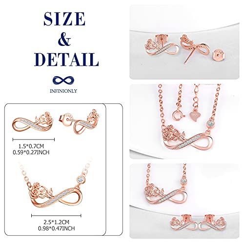 INFINIONLY Collana Orecchini da donna, parure di gioielli in argento 925, ciondolo orecchini di simbolo infinito, collana orecchini simbolo infinito con fiore di rosa, zircone intarsiato, oro rosa