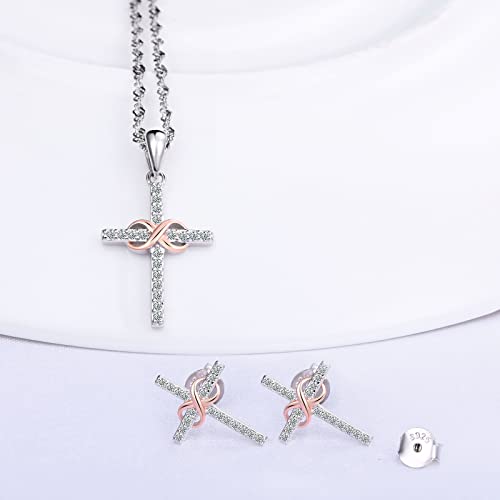 INFINIONLY Collana e Orecchini da donna ragazza, Parure di gioielli in argento 925, Croce d'argento intarsiata con simbolo dell'infinito in oro rosa, Zircone, Processo di galvanica bicolore unico