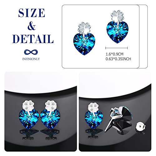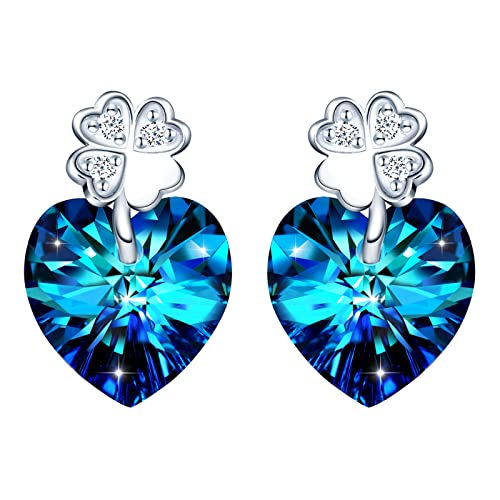INFINIONLY Orecchini cuore in Cristallo blu, Orecchini di cristallo da donna e ragazza, in argento 925, Decorato con quadrifoglio elegante, Zircone intarsiato