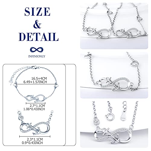 INFINIONLY Parure di gioielli, Collana Bracciale da donna ragazza, Collana Bracciale in argento 925, bracciale collana ciondolo con simbolo dell'infinito e ancora, zircone intarsiato, argento