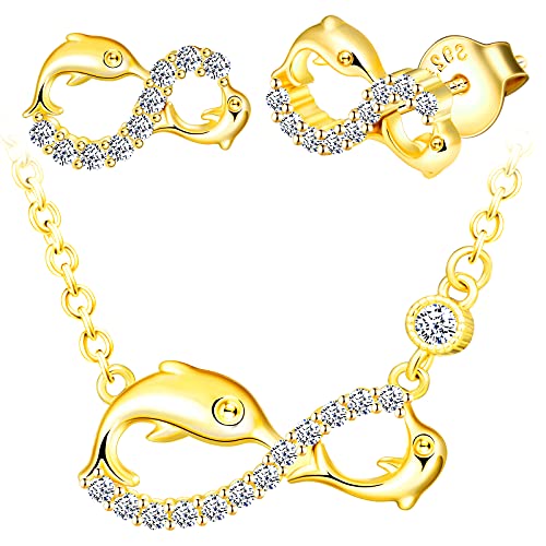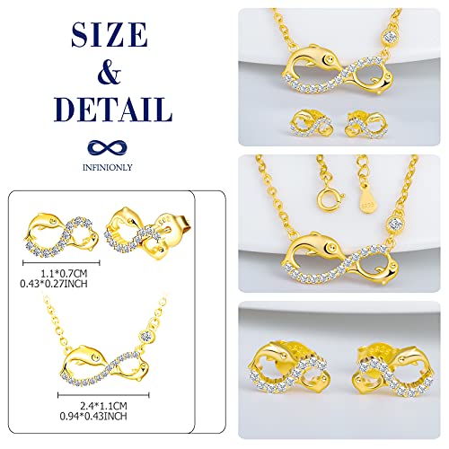 INFINIONLY Parure di gioielli, Collana Orecchini da donna ragazza, orecchini collana in argento 925, orecchini collana ciondolo simbolo dell'infinito e delfino carino, zircone intarsiato, oro