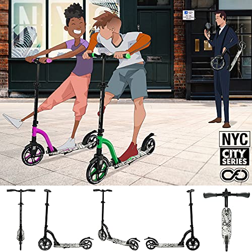 VELOCITÀ MASSIMA- Le grandi ruote in poliuretano (PU) ad alto rimbalzo (230mm/180mm) garantiscono la velocità massima. Il monopattino NYC è anche dotato di una comoda cinghia di trasporto sopra la spalla per passare facilmente dalla strada alla scuola o all'ufficio.