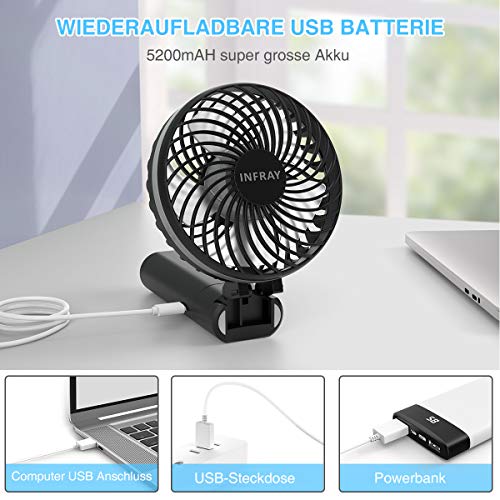 Infray Ventilatore a mano con power bank da 5200 mAh, piccolo ventilatore a mano con schermo di visualizzazione, mini ventilatore da tavolo portatile con batteria, 5 livelli, 5-20 ore di lavoro (nero)