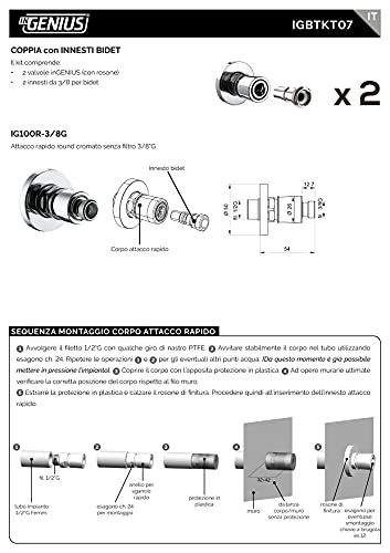 InGENIUS Coppia di Innesti 3/8" per bidet, + 2 Valvole Rubinetto inGENIUS, Chiusura Automatica (filetto muro 1/2"G) Ottone Cromato, Prodotto interamente in Italia