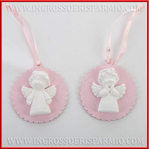 Ingrosso e Risparmio 6 Angioletti appendini in Gesso Bianco su Tondo in Legno Rosa con nastrino, Assortiti in 2 Varianti, Piccole bomboniere, segnaposto Battesimo Bimba (con Confezione Verde)