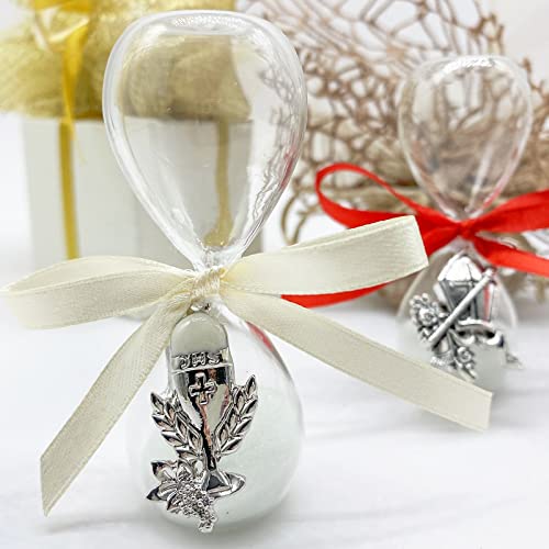 Ingrosso e Risparmio Clessidra in Vetro con Sabbia Bianca Decorata da Un Ciondolo per Comunione o cresima, bomboniere Originali (Tondo Calice e Ostia)