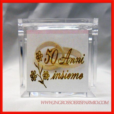 Ingrosso e Risparmio Scatole in plexiglass portaconfetti con Immagine Raffigurante Due FEDI di Oro e Scritta 50 Anni Insieme.. su di Un Lato - Bomboniera Anniversario segnaposto (Kit 24 pz)