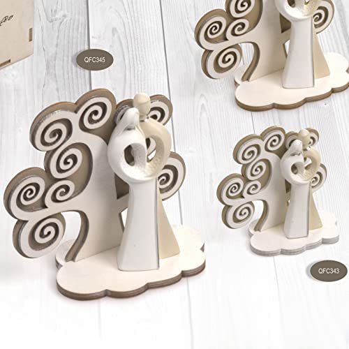 SPECIFICHE: Statuetta coppia di innamorati di colore bianco e tortora, posti su una base in legno con sfondo a forma di albero della vita.