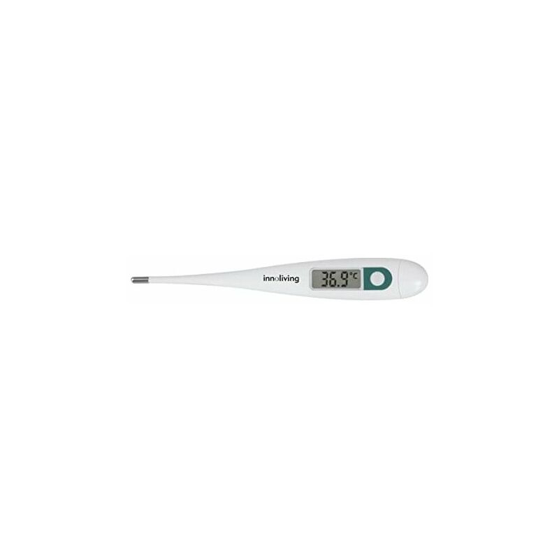 Innoliving Termometro Digitale Con Sonda Rigida - Sonda rigida - Resistente all'acqua (IP22) - Range di misurazione: (32,0~42,0)°C / (89,6~107,6)°F - Accuratezza di misurazione: ±0,1°C/0,2°F (35,5°C~42,0°C / 95,9°F~107,6°F) ±0,2°C / 0,4°F (32,0°C~35,5°C / 89,6°F~95,9°F) - Unità di misura: 0,1°C / 0,1°F - Tempo di risposta: 60 secondi - Segnale acustico - Memoria ultima misurazione - Autospegnimento dopo 10 minuti di inutilizzo - Temperatura di stoccaggio/trasporto: (-25~55)°C, ?95% RH - Temperatura ambiente durante l'utilizzo: (5~35)°C, ?80% RH - Pressione atmosferica di utilizzo: 700~1060 hPa - Alimentazione: Batteria alcalina, tipo LR41, 1,5 V - Durata batteria: 100 ore in funzionamento continuo - Peso: 10 g circa