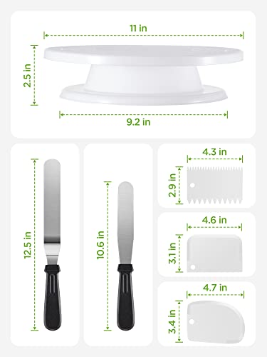 Spatola professionale: Il kit supporto per torte include due tipi di spatole. La prima è una spatola ad angolo di 6 pollici, progettata con una piega angolata appena sotto la maniglia per evitare che le dita tocchino la glassa durante la decorazione. La seconda è una spatola diritta di 6 pollici, perfetta per spalmare la glassa o la crema su aree più grandi della tua torta.