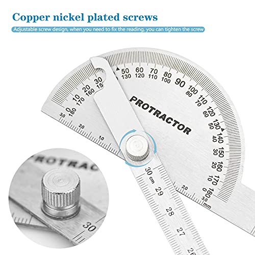 ➣ Facile da usare. Il goniometro in metallo può ruotare il goniometro di 180 gradi regolando il dado e può bloccare il righello ad un angolo fisso nella posizione desiderata per misurare l'angolo rapidamente e facilmente.