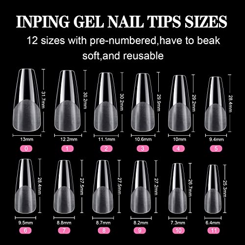 INPING Punte per unghie morbide, 504 pezzi, lunghe per balletto, chiodi, trasparenti, con copertura parziale, resistenti alle rotture, preformate, saloni per unghie, 12 misure