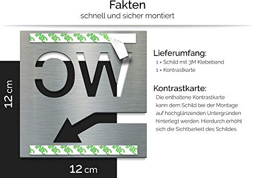 ⭐ SPECIFICHE TECNICHE - Altezza: 120 mm, Spessore materiale: 1 mm - CONSEGNA: 1 etichetta della porta in acciaio inox (V2A) con strisce adesive 3M di alta qualità, cartina di sfondo (aumenta il contrasto del pittogramma su superfici luminose) SUGGGERIMENTO - Quando la segnaletica della vostra toilette pensate anche alla segnaletica sufficiente della via verso la toilette, perché "la via è l'obiettivo...."