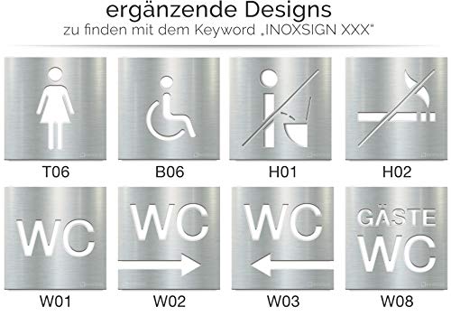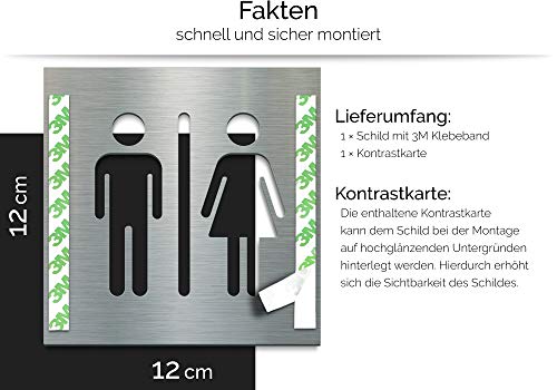 ⭐ SPECIFICHE TECNICHE - Altezza: 120 mm, Spessore materiale: 1 mm - CONSEGNA: 1 etichetta della porta in acciaio inox (V2A) con strisce adesive 3M di alta qualità, cartina di sfondo (aumenta il contrasto del pittogramma su superfici luminose) SUGGGERIMENTO - Quando la segnaletica della vostra toilette pensate anche alla segnaletica sufficiente della via verso la toilette, perché "la via è l'obiettivo...."
